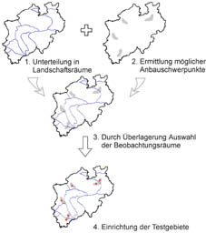 Zur Erfassung der Wirkungen von HR-Raps in unterschiedlichen Landschaften und bei unterschiedlichen Umweltbedingungen wird in einem geschichteten Ansatz die Fläche von NRW in repräsentative Räume unterteilt. Als erste Gliederungsebene bieten sich acht Großlandschaften an, wie sie die LANUV NRW verwendet. In einem zweiten Schritt werden regionale Anbauschwerpunkte ermittelt. Durch Überschneidung beider Karten ergeben sich Regionen (Beobachtungsräume), in denen das Monitoring vorrangig etabliert werden soll.